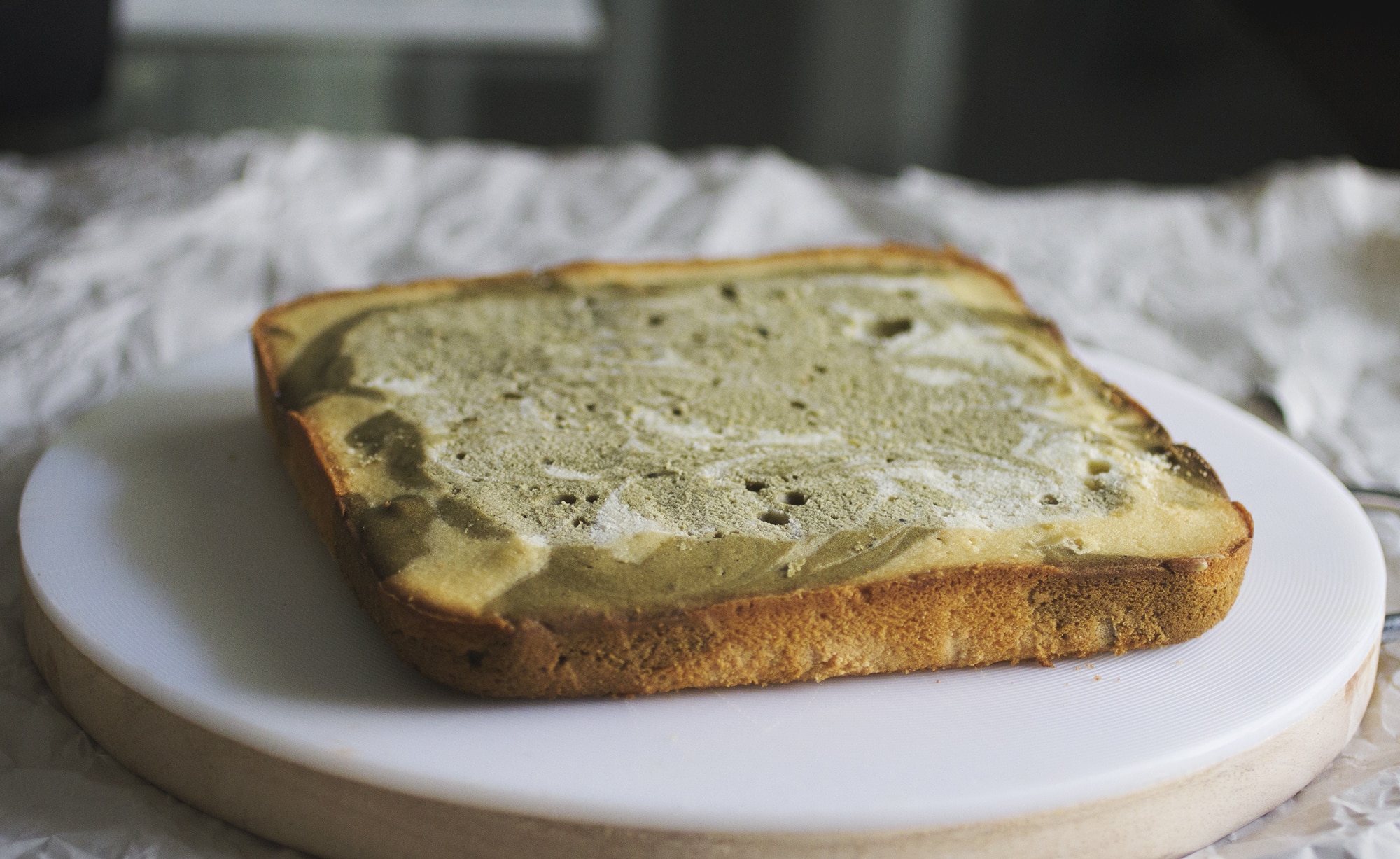 You can use whatever cake you like for this; I chose a scaled down version of this buttermilk cake from Sweetapolita–it’s dense and tightly-crumbed which makes it very easy to cut and shape. I tried it both with a plain vanilla cake base and then with a marbled base, swirling matcha into half of the silky batter. Both yielded a slightly drier cake, which I thought was perfect for big swoops of frosting–and the slightly bitter notes of matcha are an excellent complement to the typically uber-sweet buttercream.