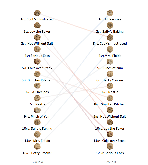 Although the point of this exercise is to show the crowd-pleasing cookies rankings as an aggregate, the final rankings from all 30 tasters shown in the above Tableaus don’t accurately line up with the opinion of my tastebuds.