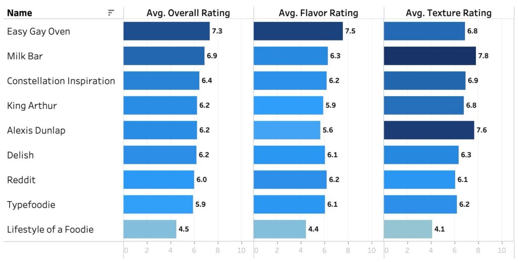 But after asking 38 tasters to rank each of the 9 corn cookie recipes, a clear winner emerged! Easy Gay Oven wins the average overall rating and flavor rating (but notably, Milk Bar takes top honors in texture rating).