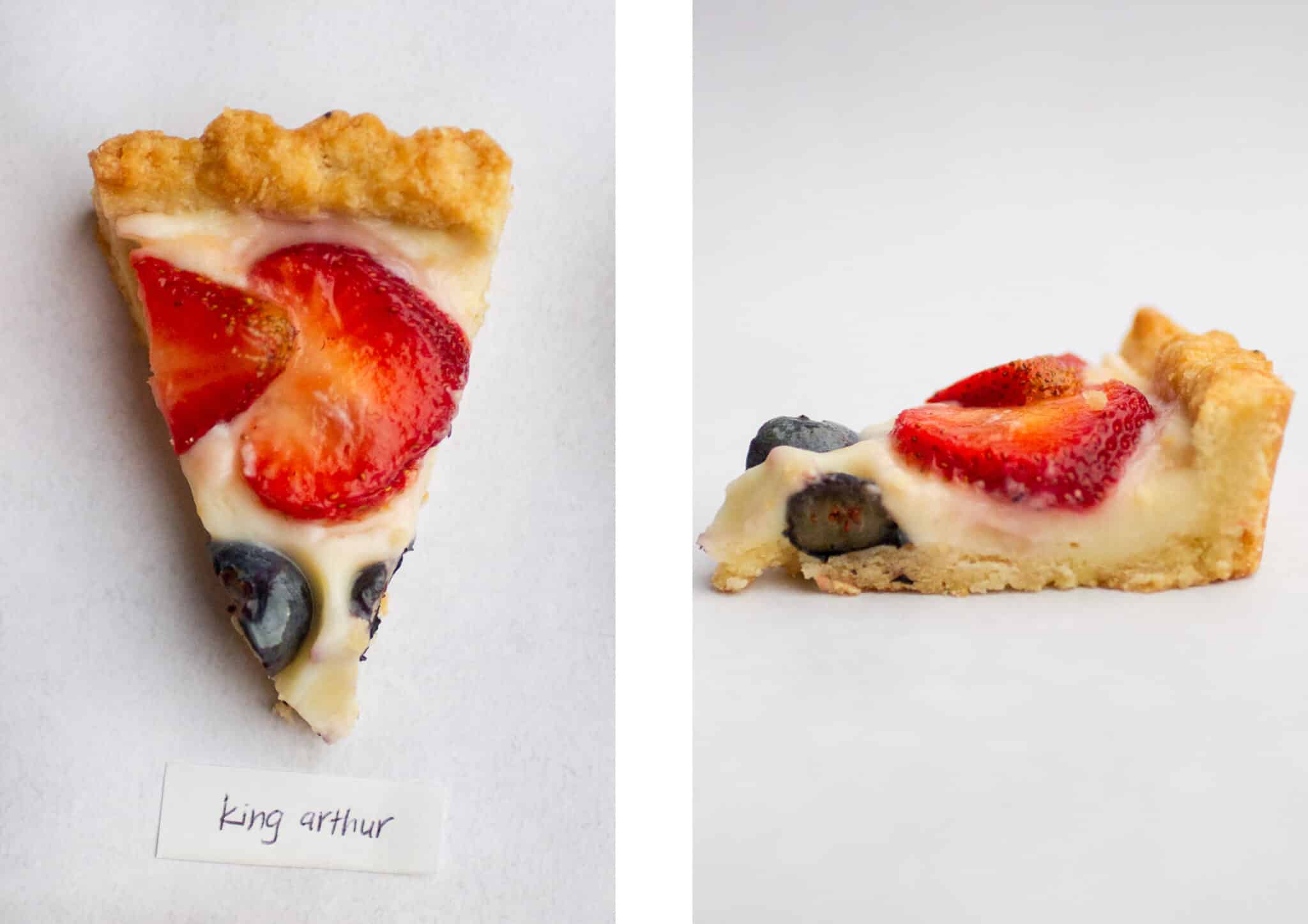 King Arthur’s pâte sucrée uses granulated sugar and an egg yolk for a dough that gets rolled out and baked using pie weights. The pastry cream is one of the simplest formulas with a modest one cup of milk, a whole egg, 1/4 cup of sugar and a combination of flour and cornstarch as thickeners.