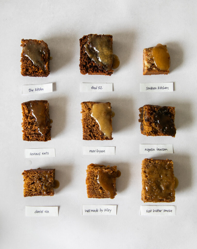 I went the modern (and in some cases, probably Americanized) route for all 9 sticky toffee pudding recipes that I tested in this bake off–i.e. they were all baked rather than steamed. But there were lots of other factors that we got to compare within recipes, so let’s get into it!