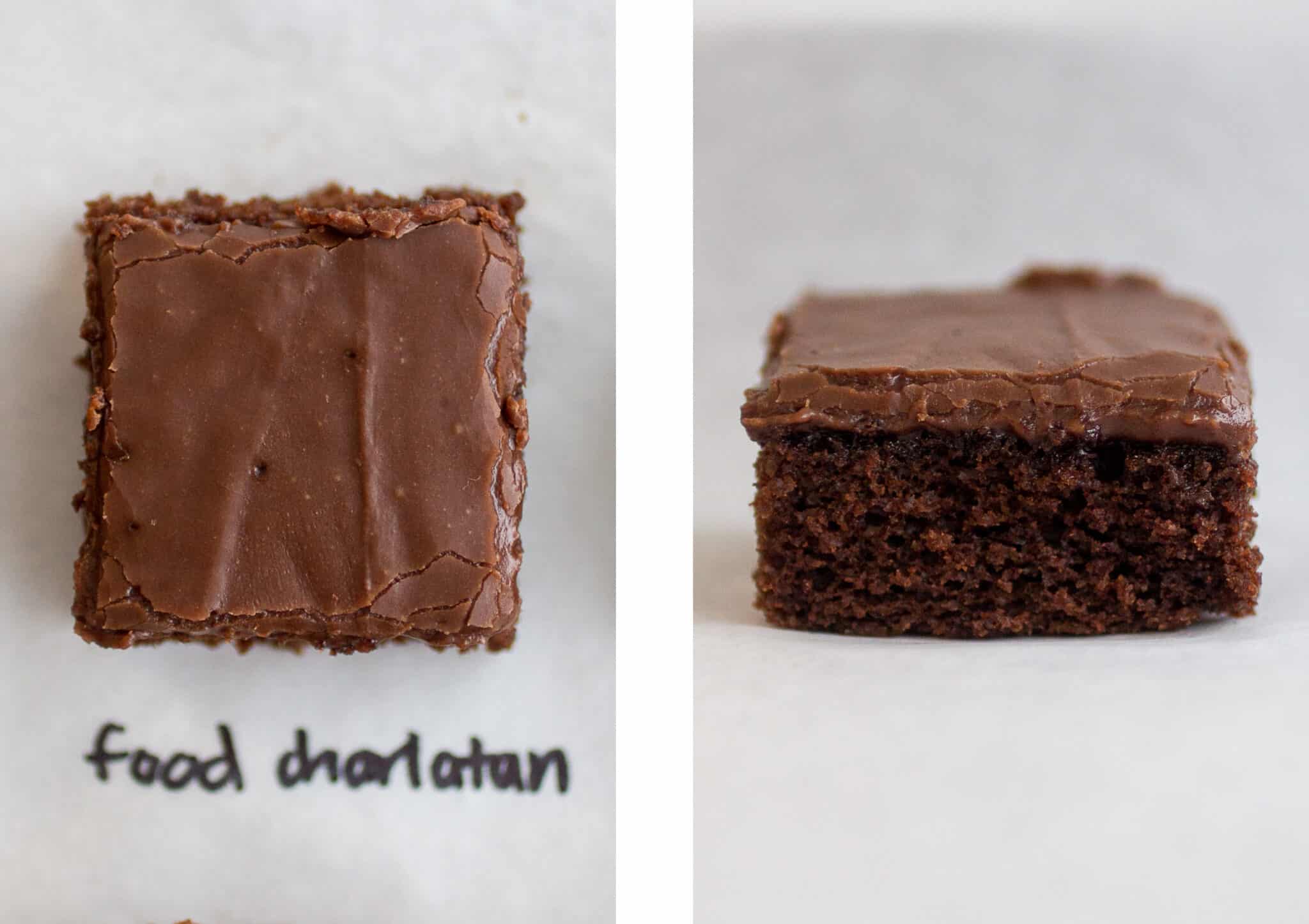 - This recipe somehow had a much richer, fuller taste; like chocolate buttercream from favorite birthday cakes growing up. A good balance between cocoa powder and butter, perhaps? Missing pecan flavoring since this was one of the three “naked” recipes. Texture was spongey to touch but also a little sticky, which felt like a good balance. Overall similar to [Food Charlatan], but ranked higher due to superior texture and the buttercream-like frosting.