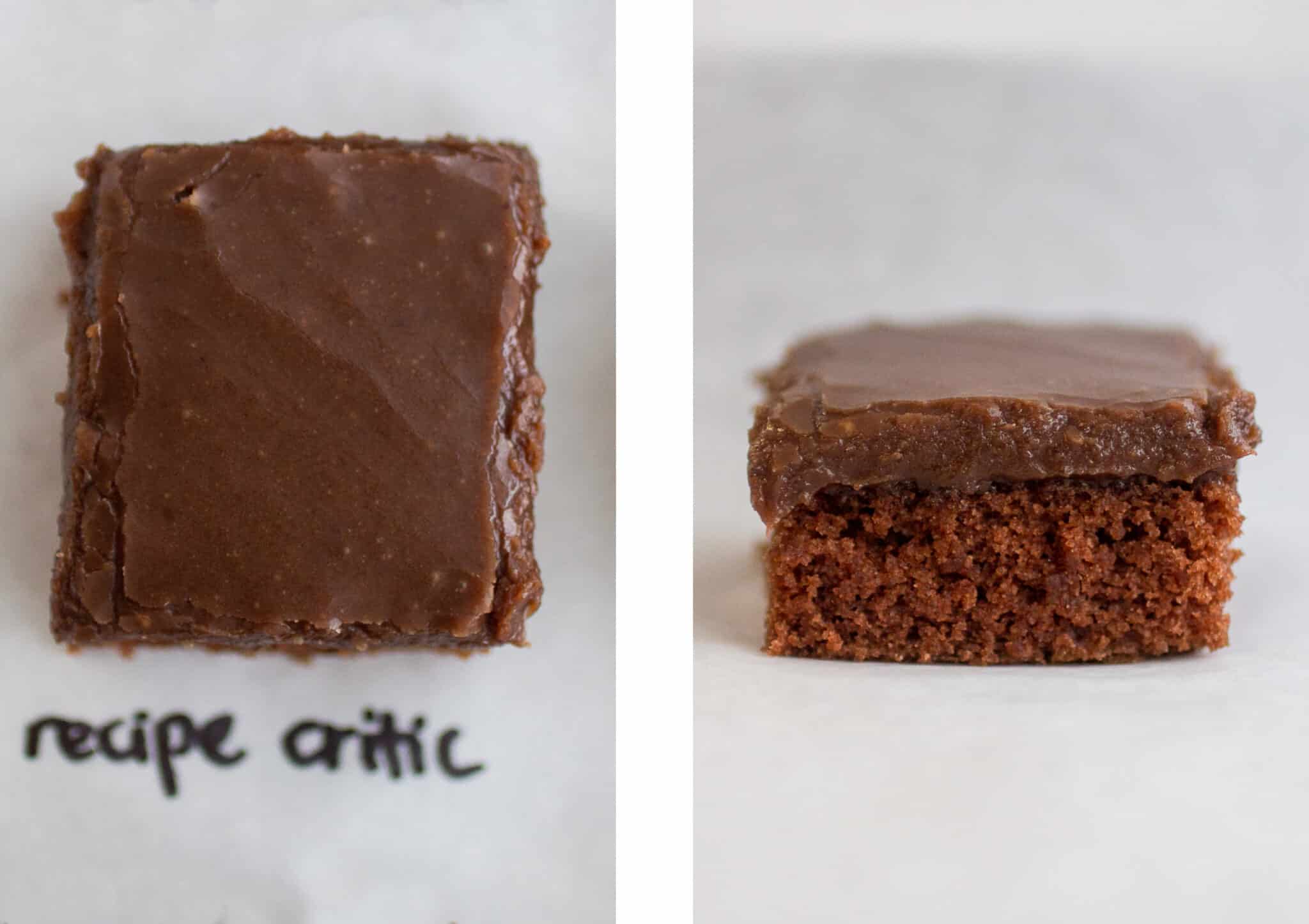 Recipe Critic: a light and fluffy, somewhat bland cake topped with a flavorful chocolate icing