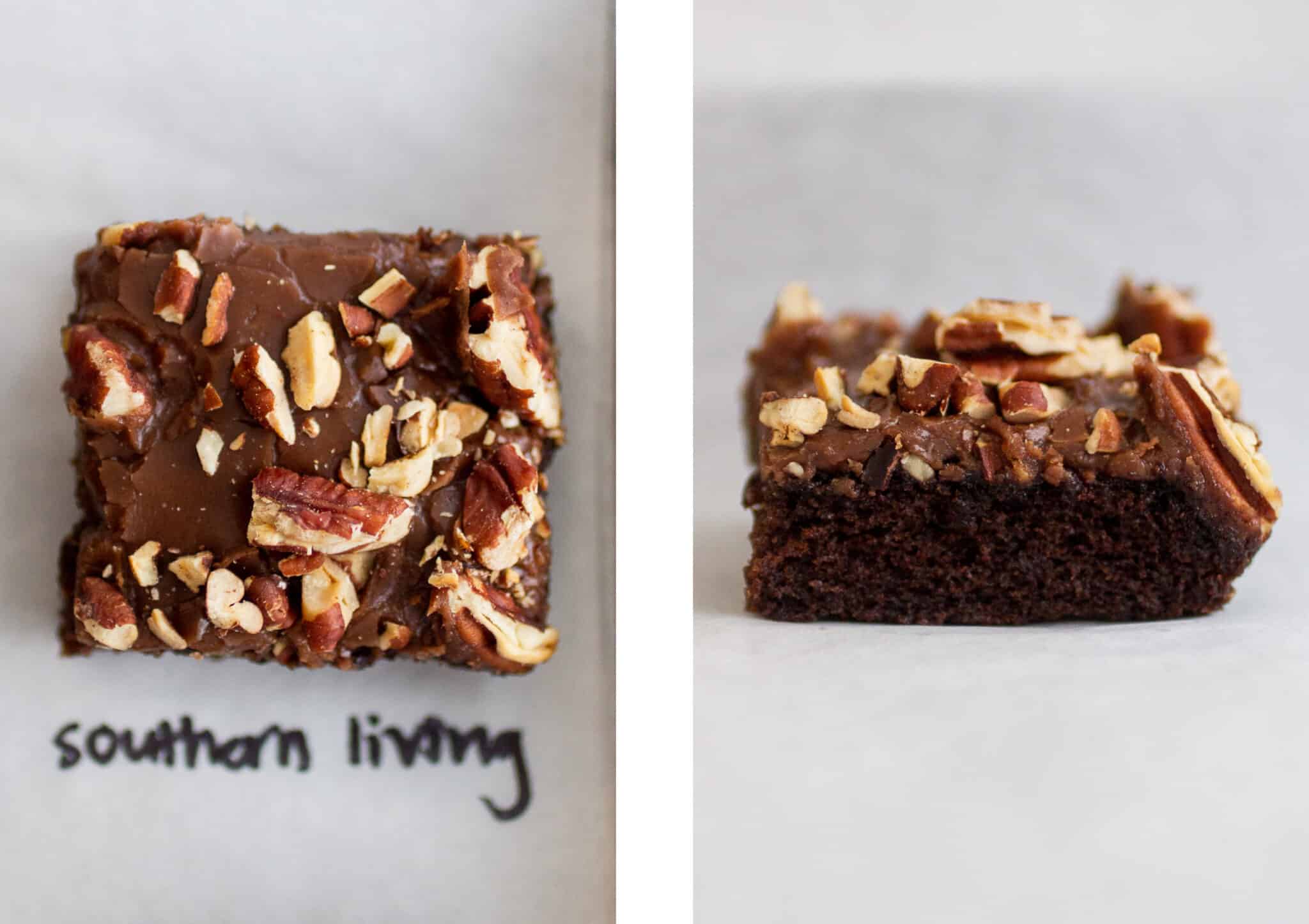 Southern Living: a moist dark chocolate cake with sugary frosting balanced by toasted pecan shards