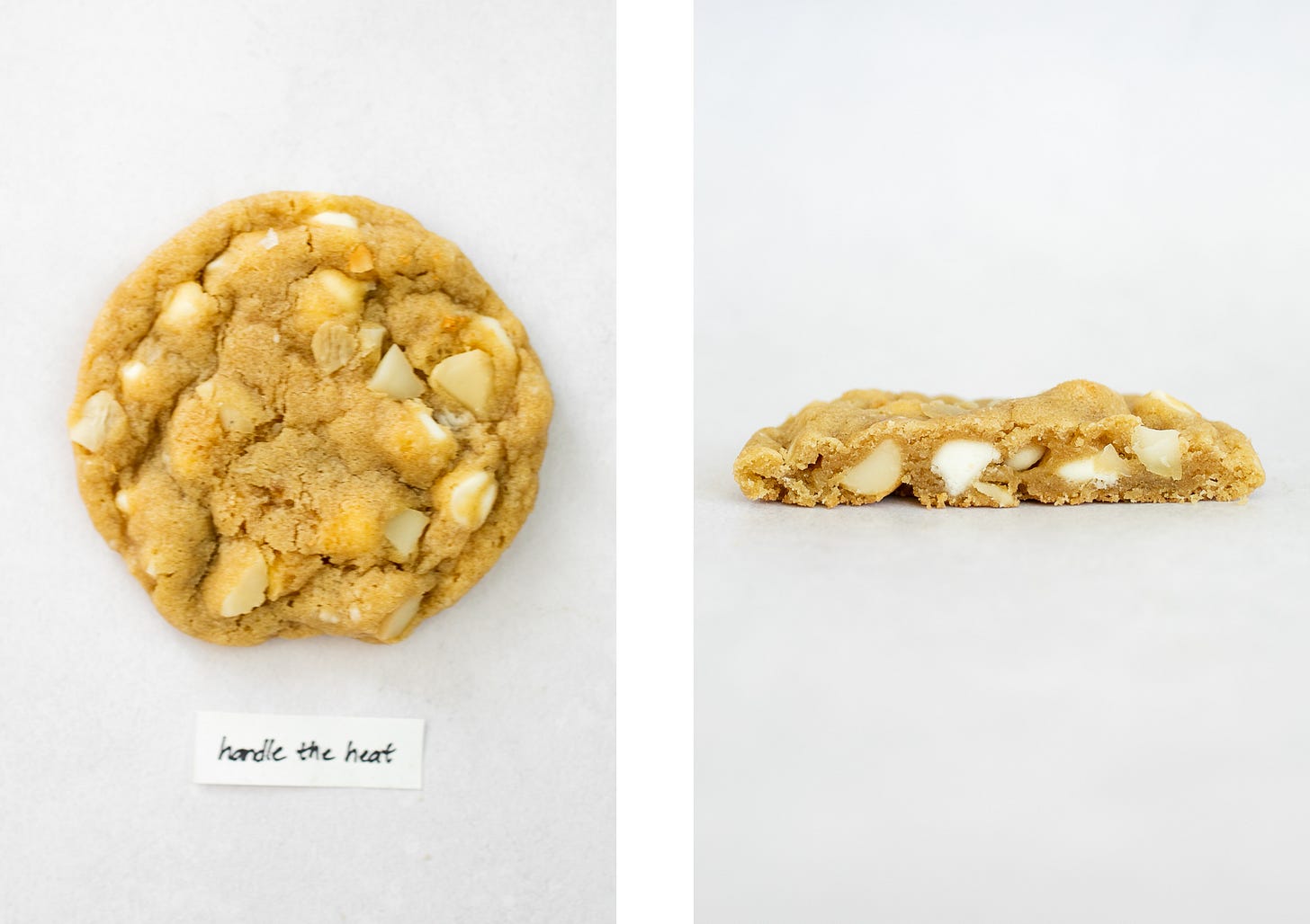 Sarah’s cookie stood out for a seemingly small detail: rather than a rough chop, she calls for finely chopped macadamia nuts which she says helps not overwhelm the cookies. And this really resonated with me–I don’t love biting into a whole macadamia nut poking out of the middle of a cookie. Aside from this detail, the base dough is similar to Handle the Heat. Both use creamed butter, egg yolks and similar ratios of butter and flour, though Sarah uses more sugar overall, less egg and slightly less butter (for one of the lowest ratios of butter total).