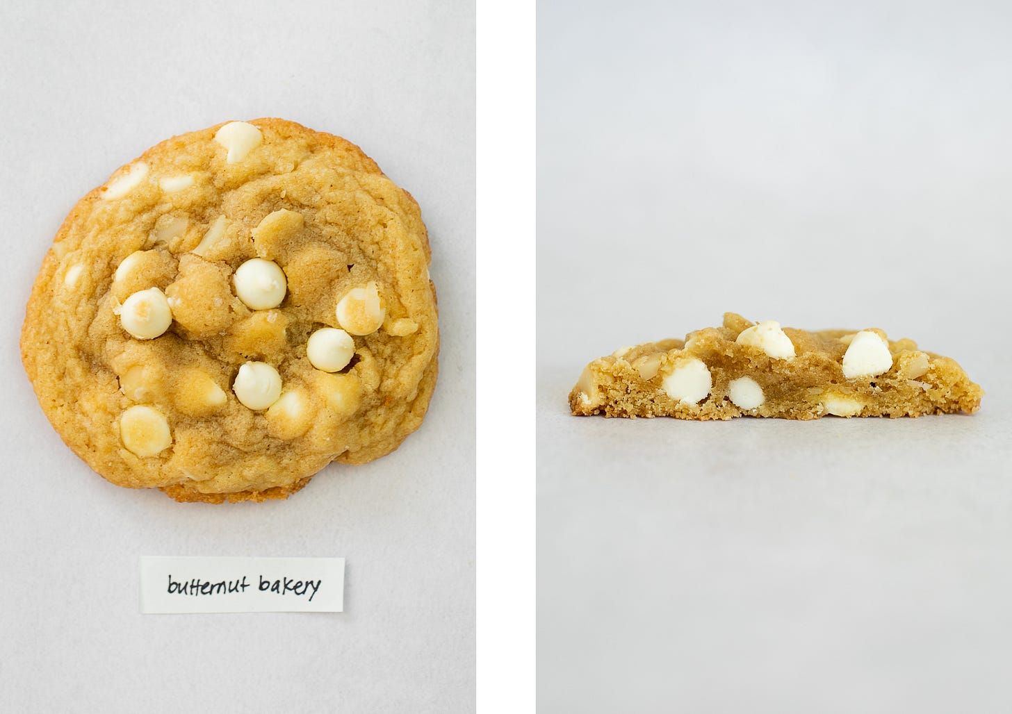 - Loved this cookie! It’s my fav bc it’s perfectly chewy throughout and had a well-balanced and nicely salted flavor with slight caramel notes but not too much. The white chocolate disks were lovely bc it distributed the white chocolate throughout the cookie more evenly. It is also gorgeous and is my pick for a “bakery-style” cookie.
