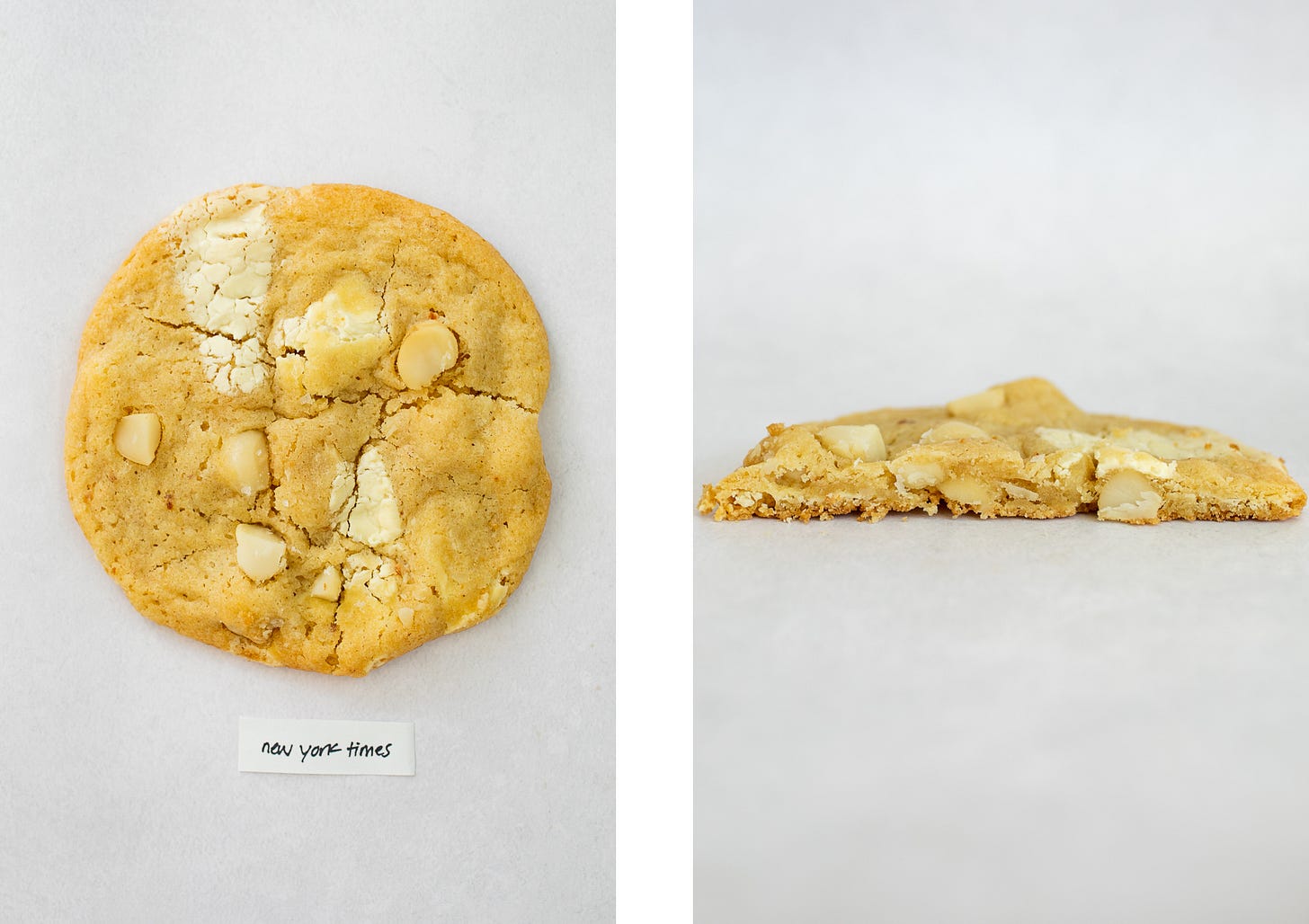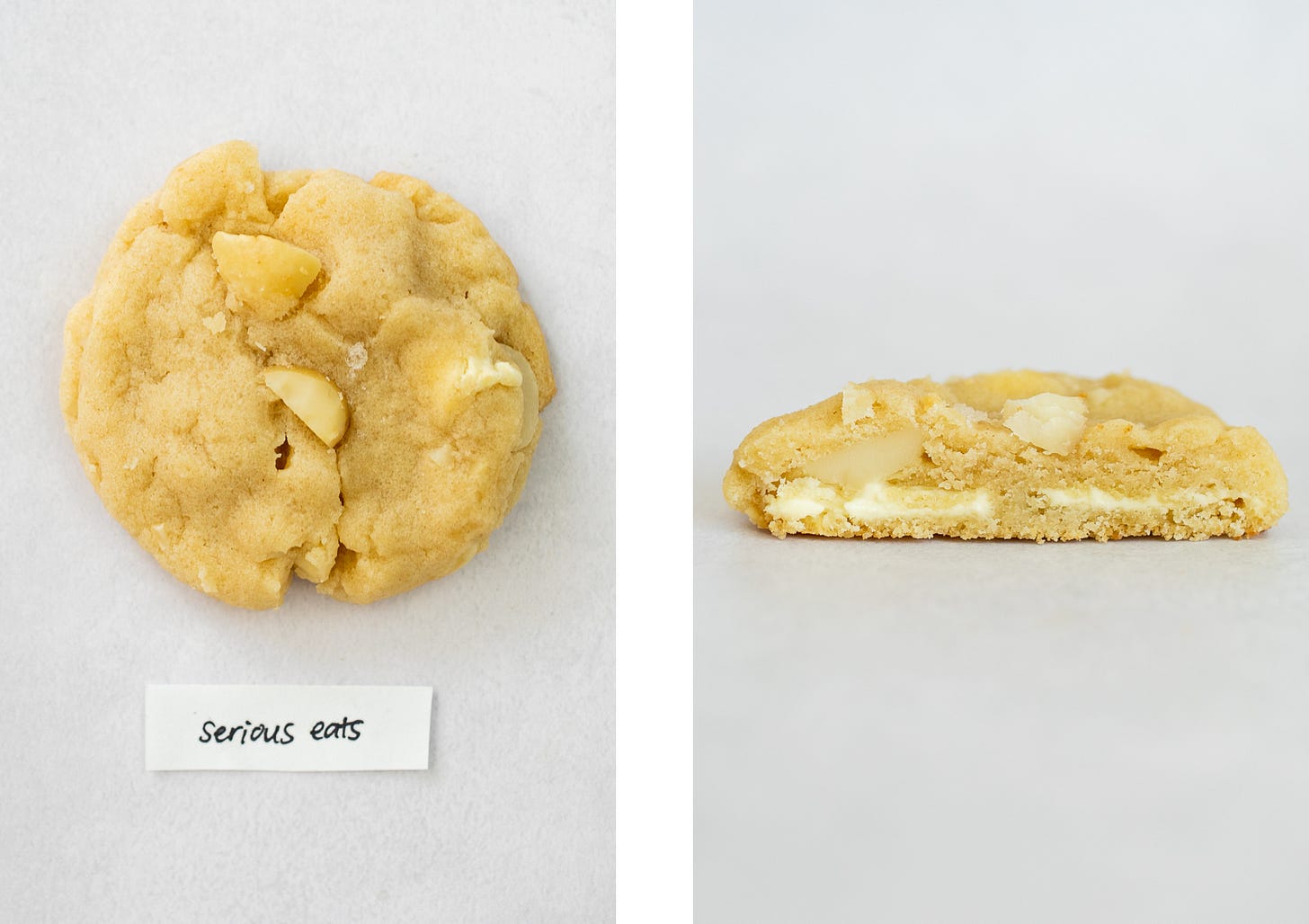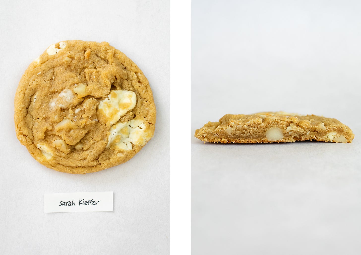 I actually found that for a white chocolate macadamia nut cookie, I slightly preferred the sugar cookie-esque flavor profile of Preppy Kitchen, a recipe that uses 100% granulated sugar. However, this is totally a personal preference–Yossy Arefi’s recipe with 100% brown sugar was almost universally praised by tasters for its incredibly caramelized flavor. (Though some did note that this pushed this cookie more into the flavor profile of a chocolate chip cookie.)