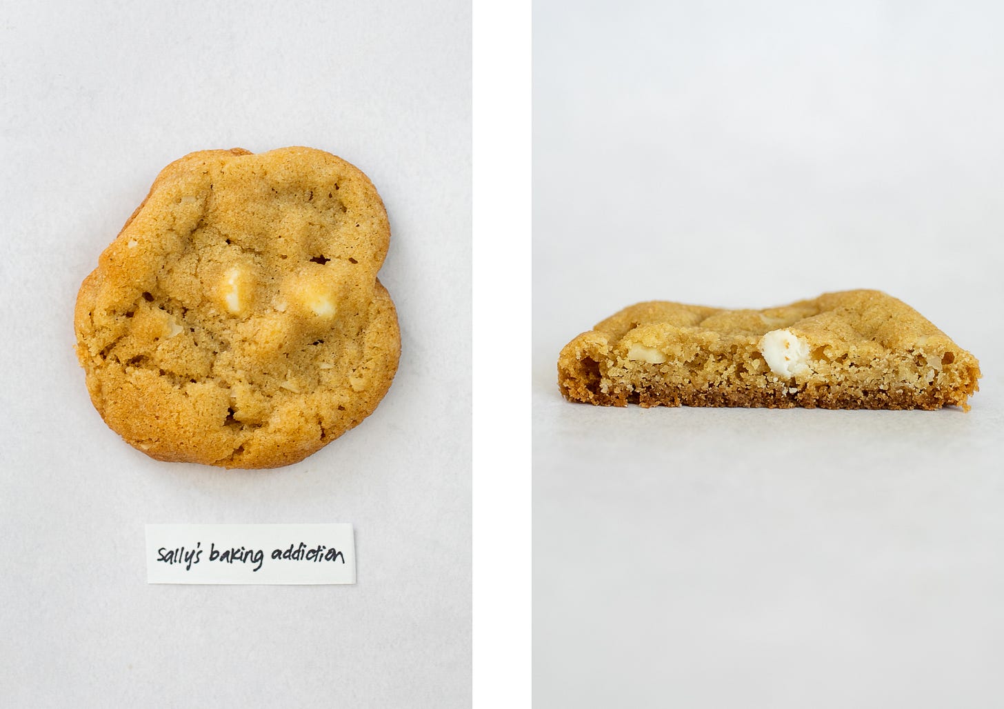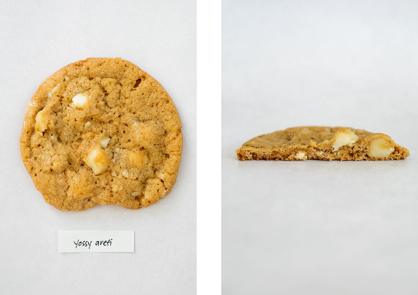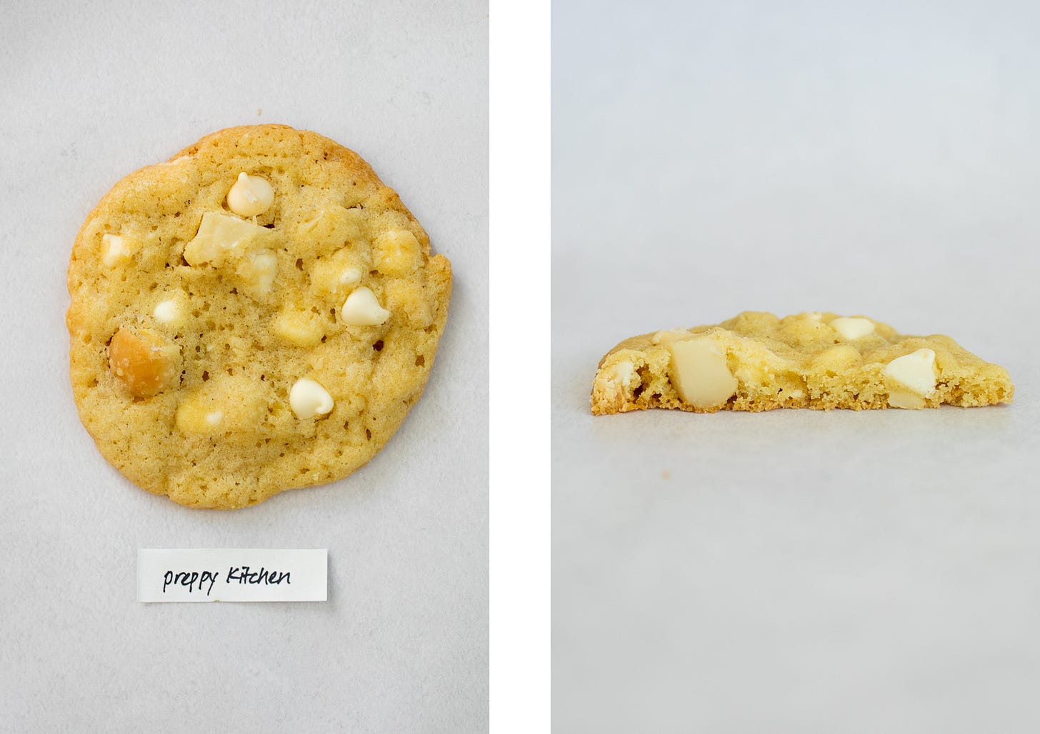 I actually found that for a white chocolate macadamia nut cookie, I slightly preferred the sugar cookie-esque flavor profile of Preppy Kitchen, a recipe that uses 100% granulated sugar. However, this is totally a personal preference–Yossy Arefi’s recipe with 100% brown sugar was almost universally praised by tasters for its incredibly caramelized flavor. (Though some did note that this pushed this cookie more into the flavor profile of a chocolate chip cookie.)