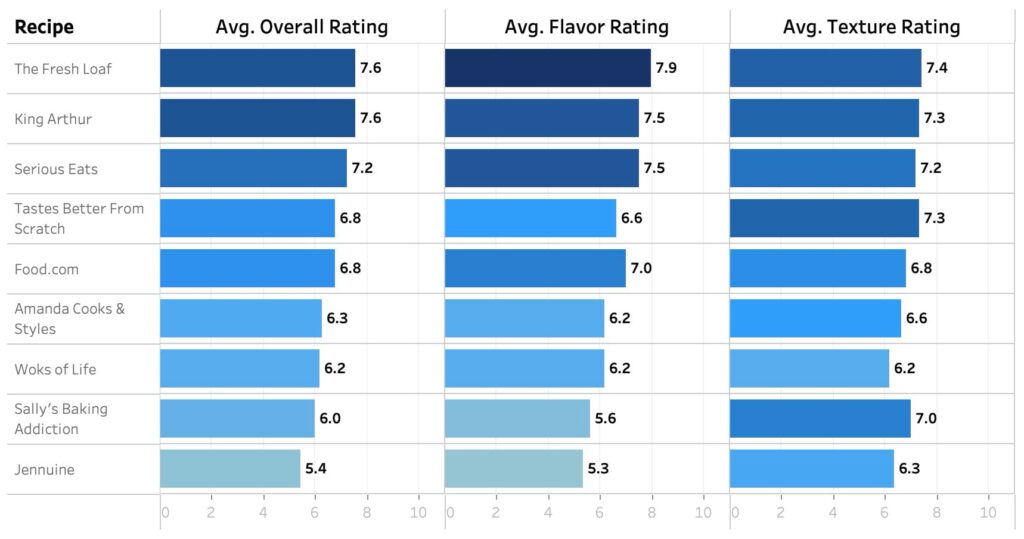 There was an interesting split in the sandwich bread-style recipes. Woks of Life and Sally’s Baking Addiction both had perfect quintessential sandwich bread textures and flavors to me. That is to say: very fluffy but not very flavorful, which landed them towards the bottom. Meanwhile, Serious Eats and Tastes Better from Scratch had many similar textural qualities, but scored better with tasters thanks to more distinct flavor profiles (a little more sour or sweet).