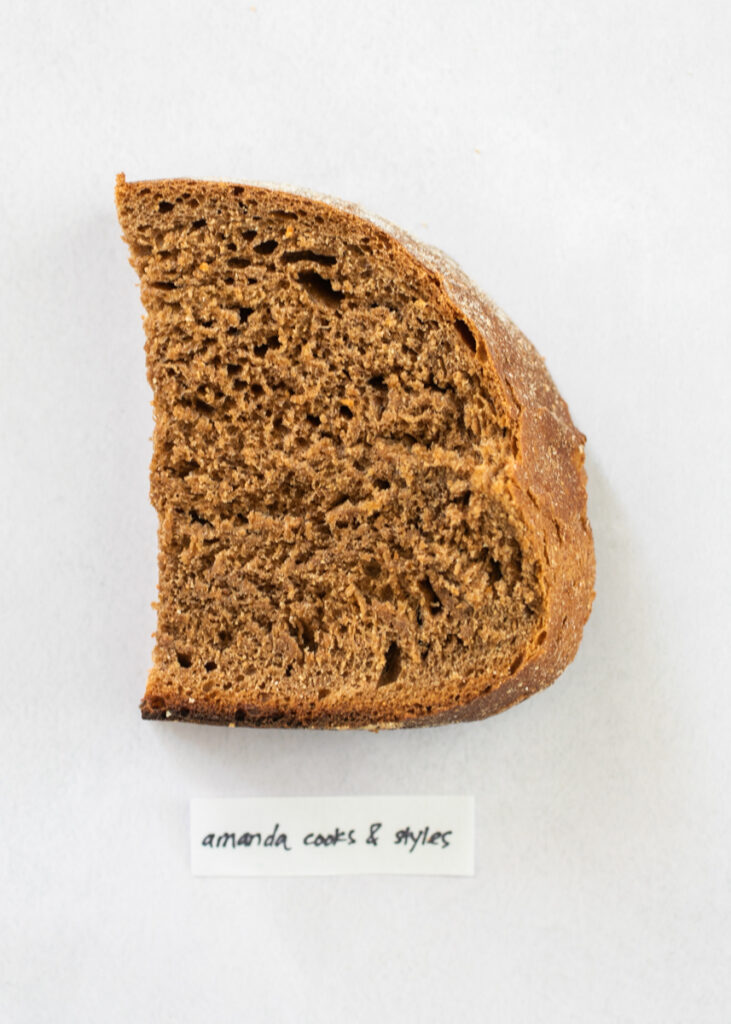 Amanda’s recipe is fairly similar to Jennuine’s molasses-heavy recipe with just a couple tweaks. While Jennuine uses a 1:3 ratio of whole wheat to all-purpose flour, Amanda uses closer to a 2:1 ratio. Amanda’s recipe also uses butter instead of oil, a smidge less molasses, but a smidge more honey and cocoa powder. She calls for shaping the loaf and baking it free-form on a sheet pan rather than in a loaf pan at the relatively high temperature of 425°.