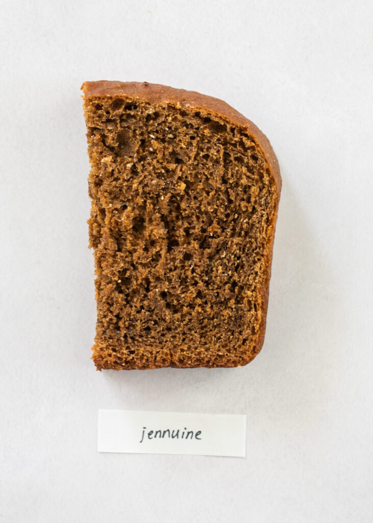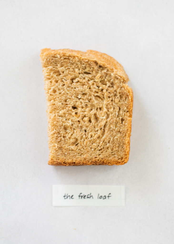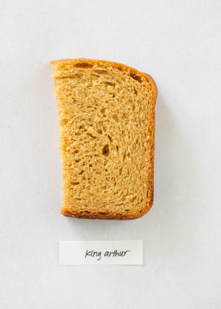 The more savory, salty profile of this bread is highlighted by the sour notes that take this loaf closer to the realm of sourdough than the rest. There’s a strong wheatiness to this loaf that several tasters remarked on–while other recipes might feel like a hybrid whole wheat loaf, this feels truly like whole wheat bread. Perfect if you want a hearty slice with plenty of airiness, a slight chew, and a subtle sour note.