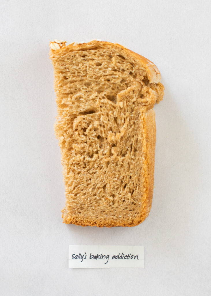 This bread reminded me EXACTLY of the store-bought whole wheat loaves I grew up eating every week–right down to the sprinkling of oats on top. The interior is incredibly fluffy with an airy stretchiness and a thin, starchy crust. Similarly to Jennuine, there was a squishy quality to the crumb where it compresses in a satisfying way when you take a bite. I absolutely loved the fluffy texture, though the flavor is very savory and not at all sweet.