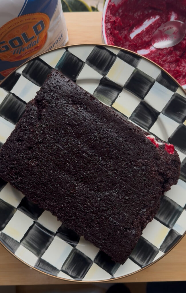 I love the ease of baking just one sheet pan of cake to make a four layer rectangular cake (just like this Southern Living carrot cake). I was dreaming up a winter version of the cake and this chocolate cranberry layer cake is it!