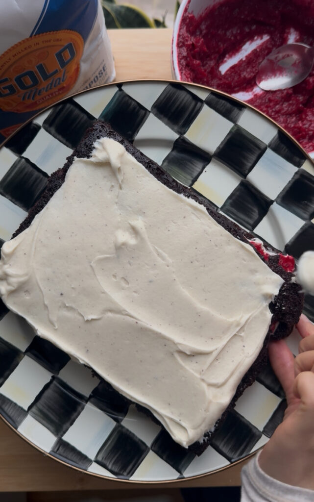 This cake includes 3 components: the cake, cranberry compote and brown butter frosting. I recommend browning the butter first and allowing it to chill while you bake the cake and make the cranberry compote. Then, let the cake and compote chill while you make the frosting.