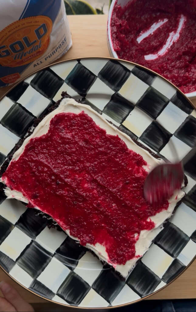 Step 9: Top with 1/3 of the cranberry compote and repeat with remaining cake layers, frosting and compote.