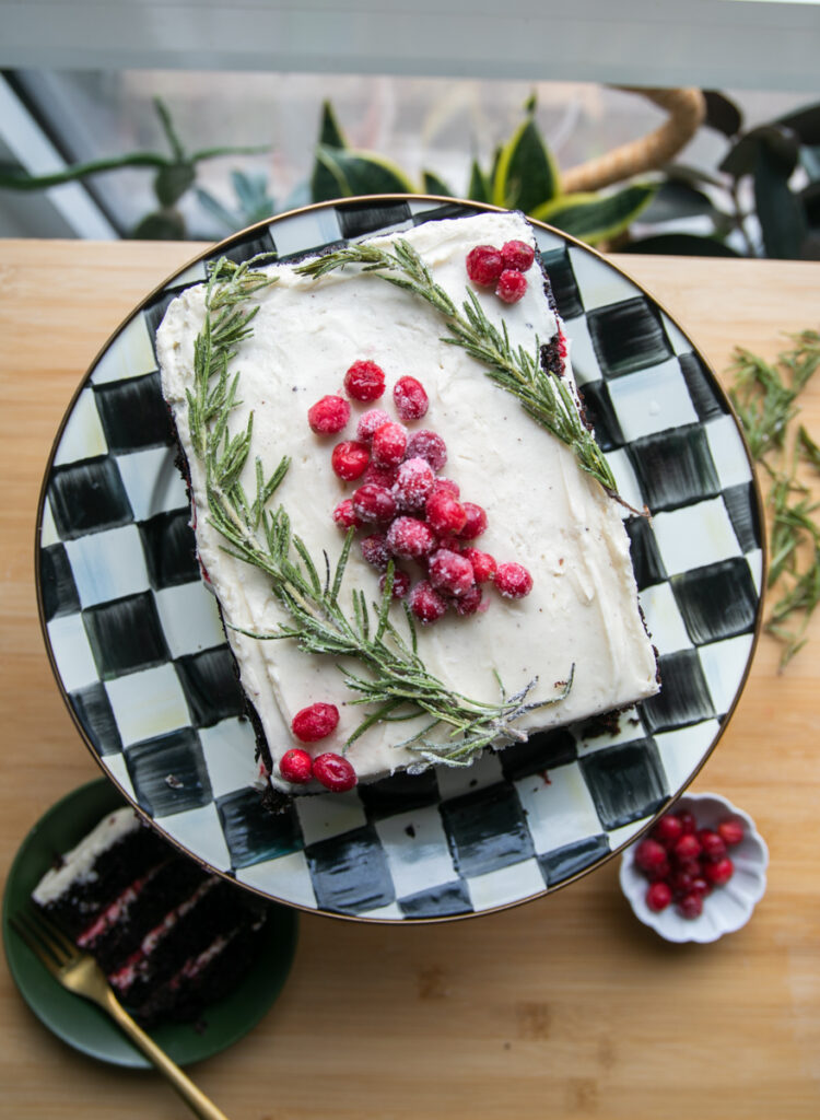 - Cut the chilled cake into fourths. Place one rectangle of cake on a cake stand and top with 1/4 of the frosting, then 1/3 of the cranberry compote. Repeat with the remaining cake layers, frosting and compote, ending with a layer of frosting. Top with sugared cranberries and rosemary, if desired.