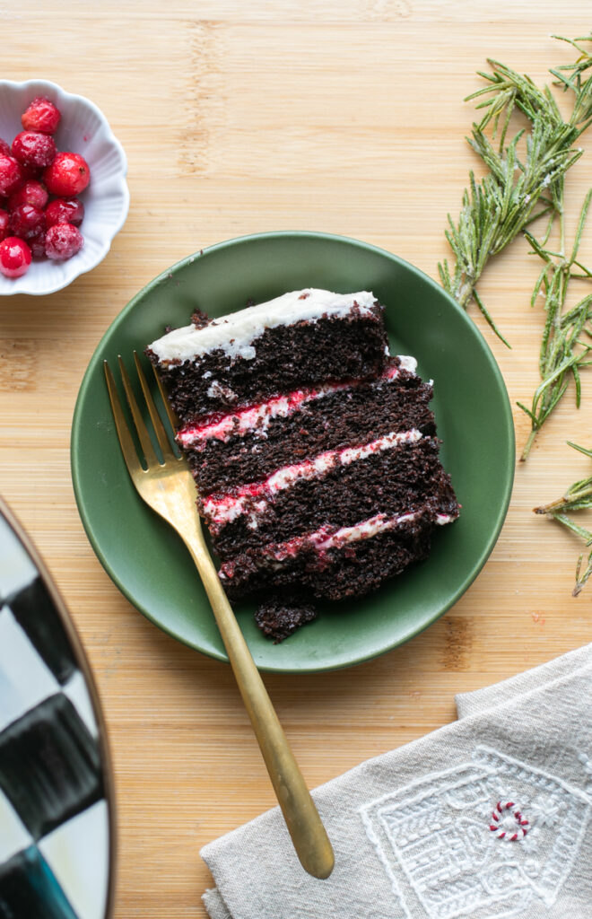 This chocolate cranberry cake is a perfect holiday centerpiece or Christmas cake! Layers of moist chocolate cake, brown butter cream cheese frosting and a fresh cranberry compote make for a decadent but bright dessert.