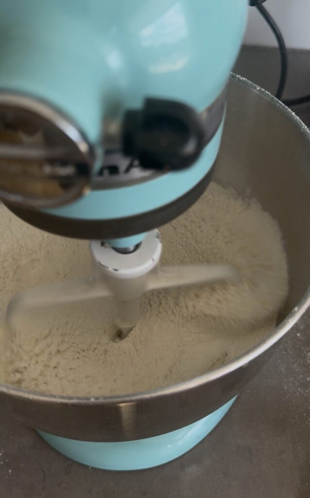 - With the mixer on low speed, add the 3/4 cup unsalted butter, softened to room temperature, 1 tbsp at a time, until all the butter is incorporated. Continue mixing for at least one full minute–the mixture should look sandy with tiny bits of butter.