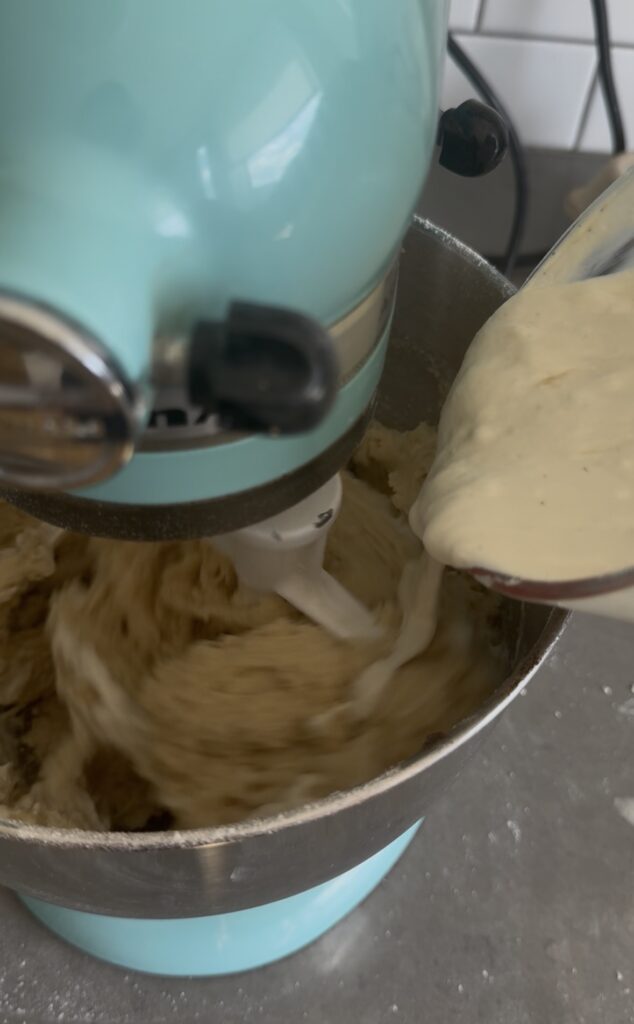 Step 6: Stream the sour cream mixture into the flour mixture and mix on medium for one minute until you have a smooth batter.