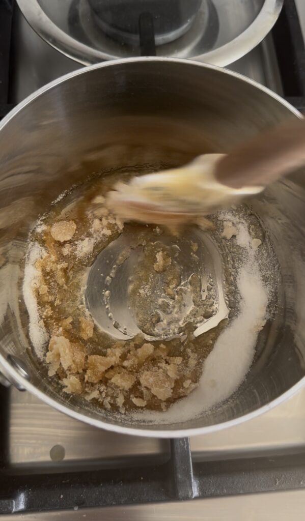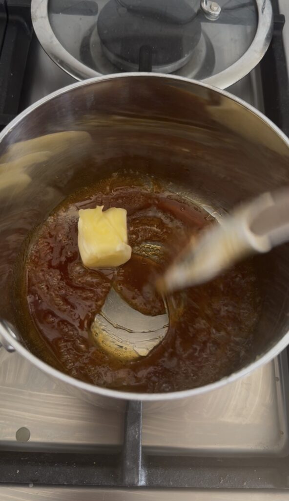 Step 10: Once the sugar is melted, turn the heat to low and quickly whisk in the butter until fully incorporated (mixture will sputter and bubble up).