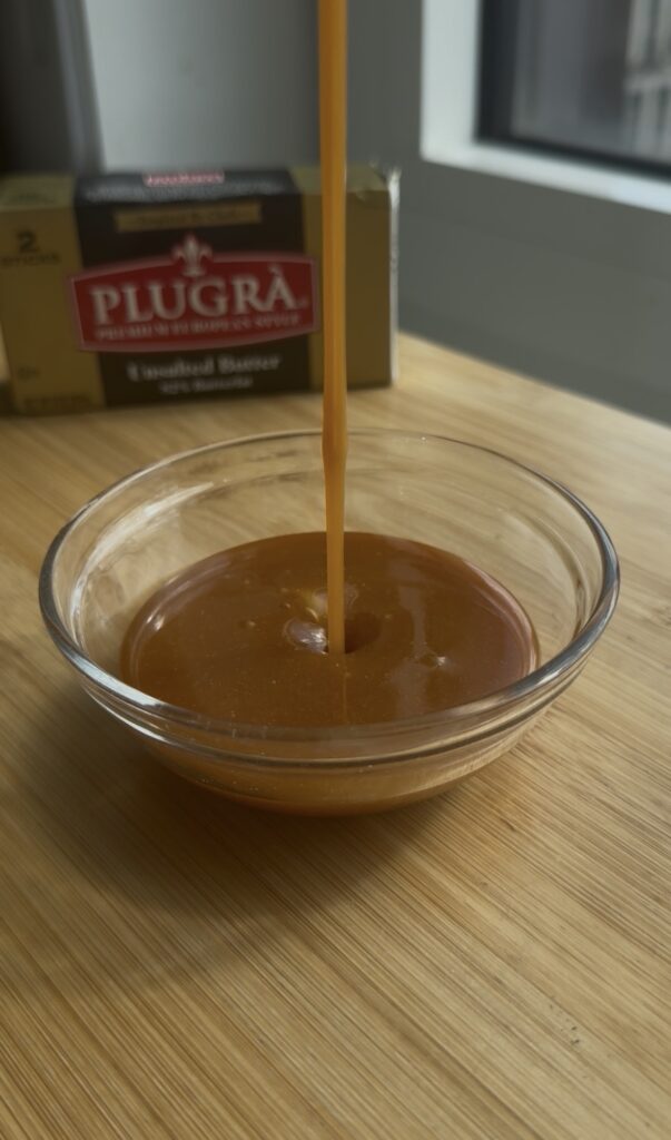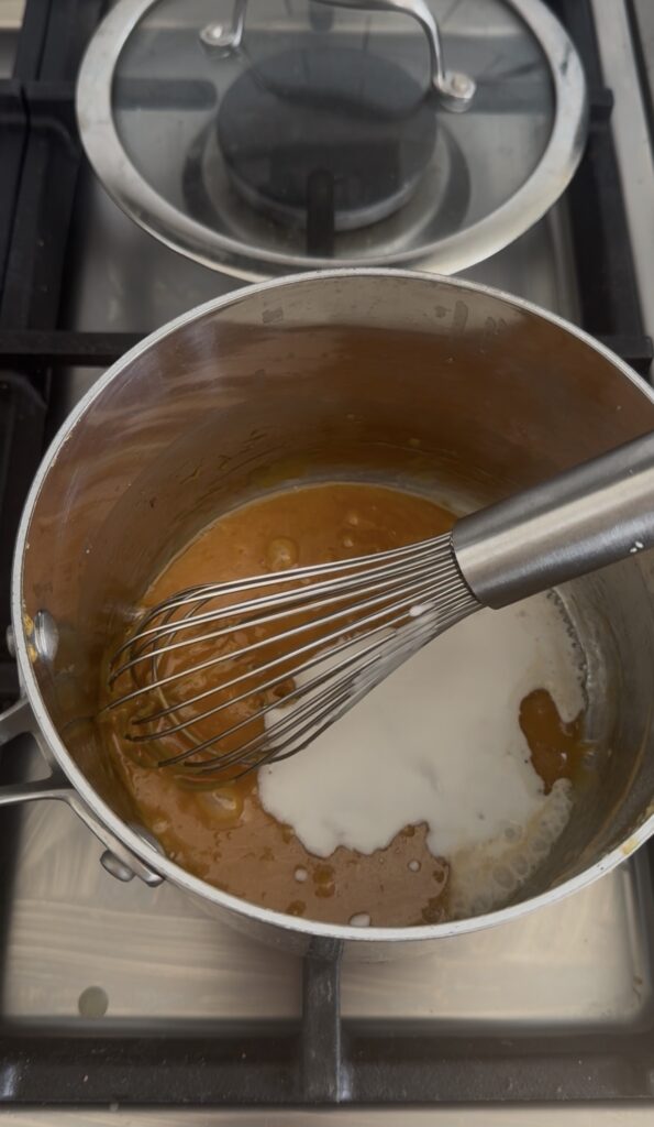 - Make sure your butter, coconut milk and salt are measured out and ready to use before starting.Add 1/2 cup granulated sugar to a small saucepan and set over medium low heat. Let cook until most of the sugar has melted into an amber syrup, nudging any unmelted sugar if needed. As soon as all the sugar has melted, quickly and carefully add 2 tbsp unsalted butter (mixture will sputter and foam up) and whisk until mostly incorporated, about 20 seconds.