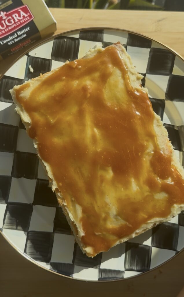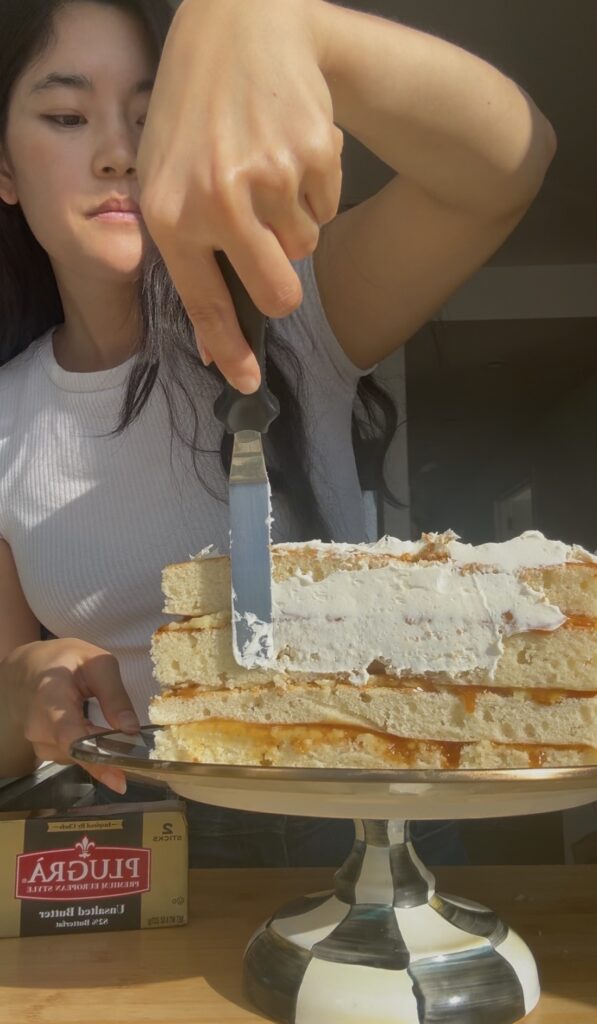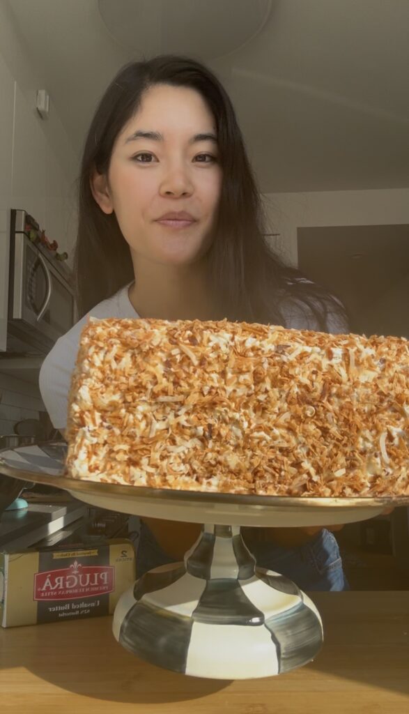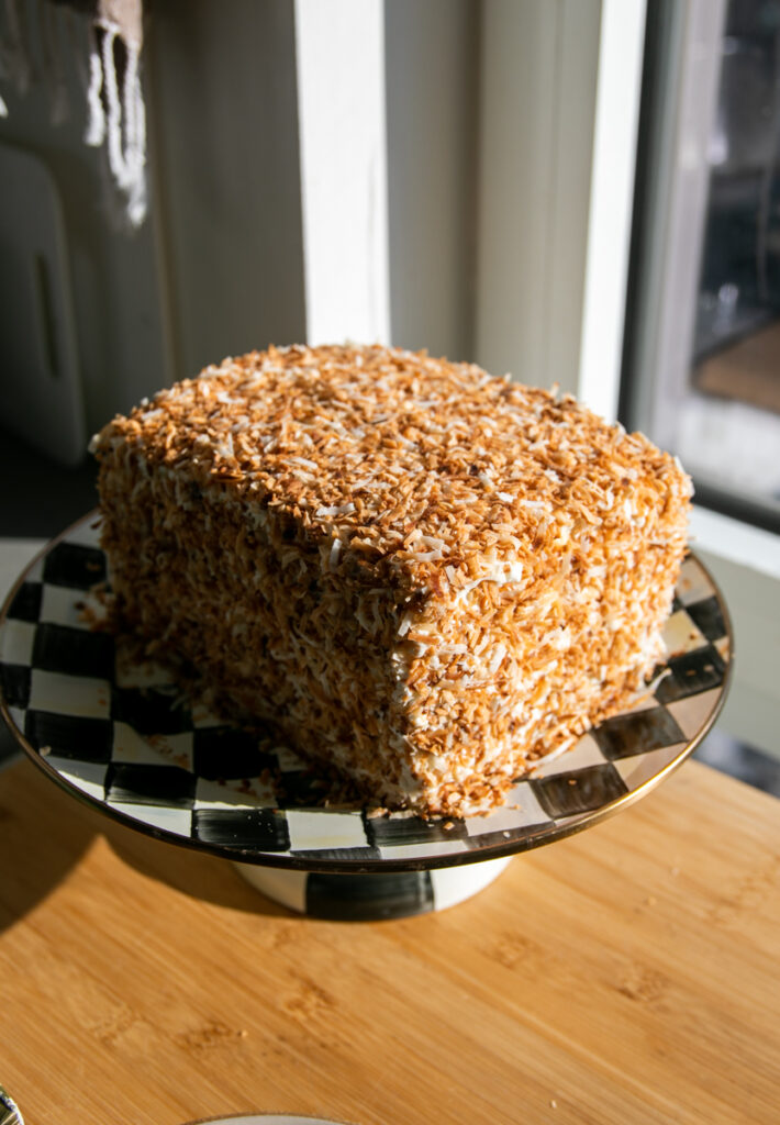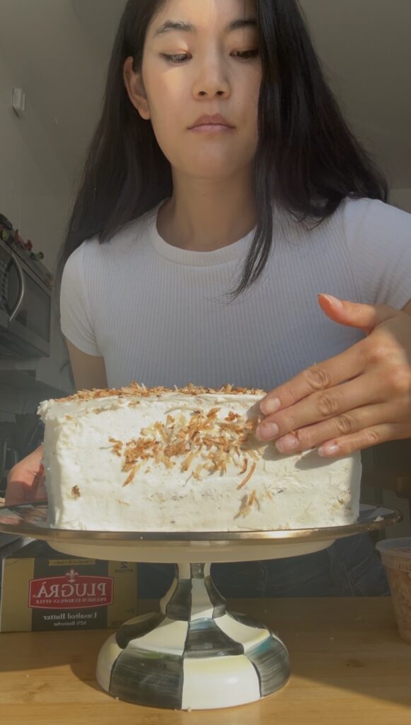 When I was thinking about the layers, I thought about something I saw a creator (I believe @bakeswithrach_) say–everyone loves her cakes (even people who don’t like cake!) because she never fills them with buttercream: only puddings or pastry creams. Some people do find the carrot cake a bit sweet, so I decided to do a coconut pastry cream inside this cake rather than buttercream.