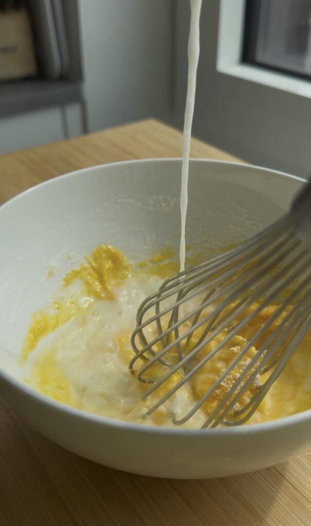 - Slowly stream the hot milk mixture into the egg yolk mixture while whisking constantly. Once you've added about half the mixture, pour the yolk mixture back into the saucepan and set over medium low heat again, whisking constantly.