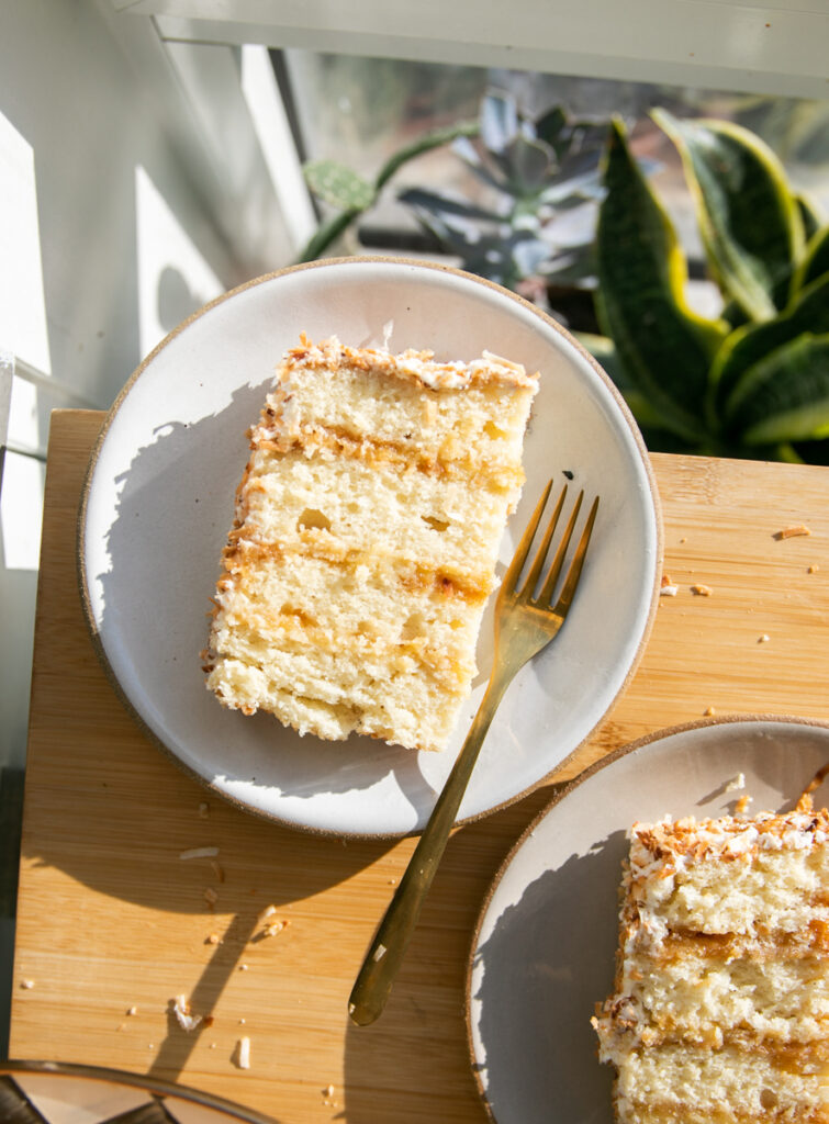 As I discovered through the coconut cake bake off, I’m not a huge fan of the texture of shredded coconut inside the cake or a strong artificial coconut flavor. So if you love a more subtle coconut flavor without a super chewy filling, this cake is perfect for you!