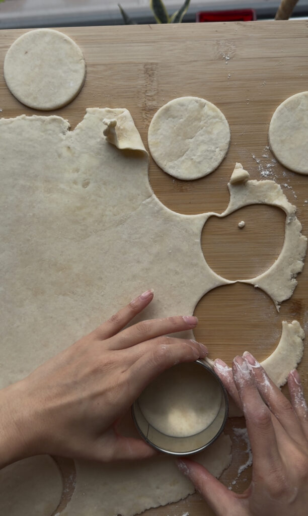 - Keep the dough rounds cold: Again, to help the pie dough keep its shape, I recommend stamping out all the dough rounds and then refrigerating them for 5-10 minutes before assembling the pie.