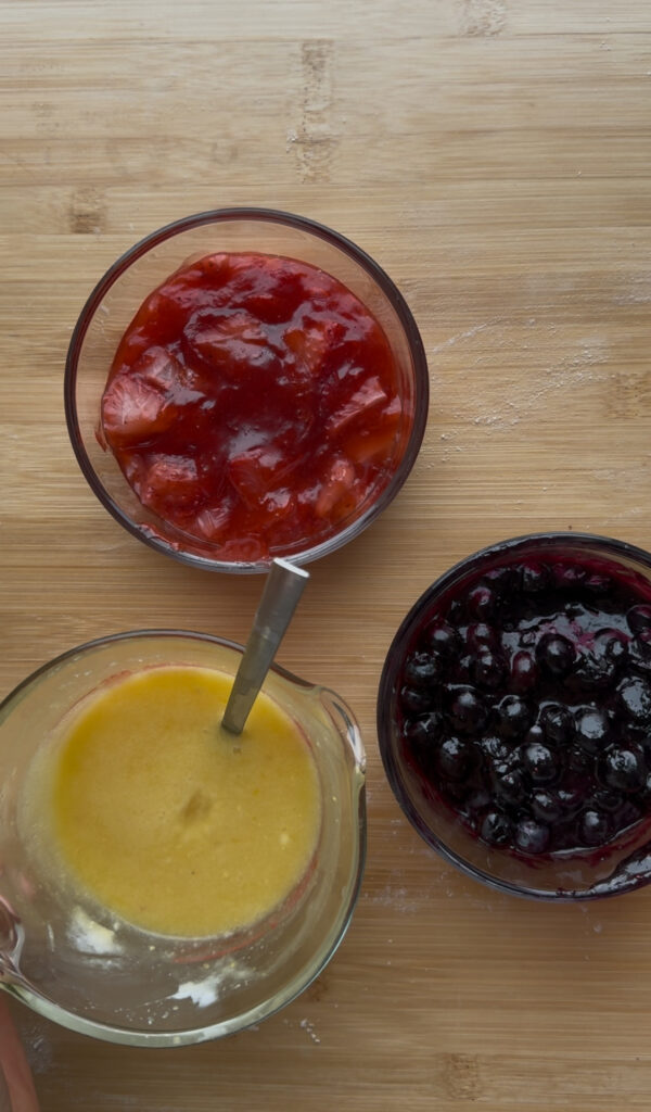 Step 2: For the blueberry and strawberry fillings, combine half of the fresh fruit and remaining ingredients and cook on the stove for 5 minutes, or until thickened. Stir in the reserved fresh fruit and set aside until fully cooled, around 30 minutes (or 20 minutes in the fridge).
