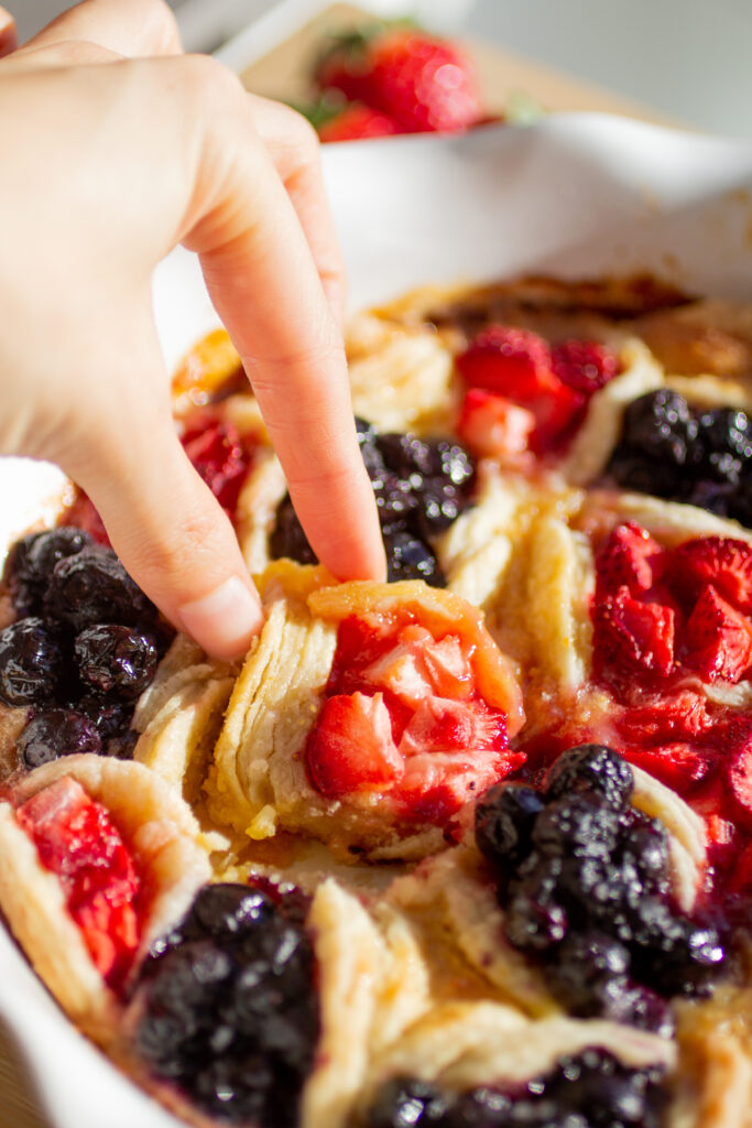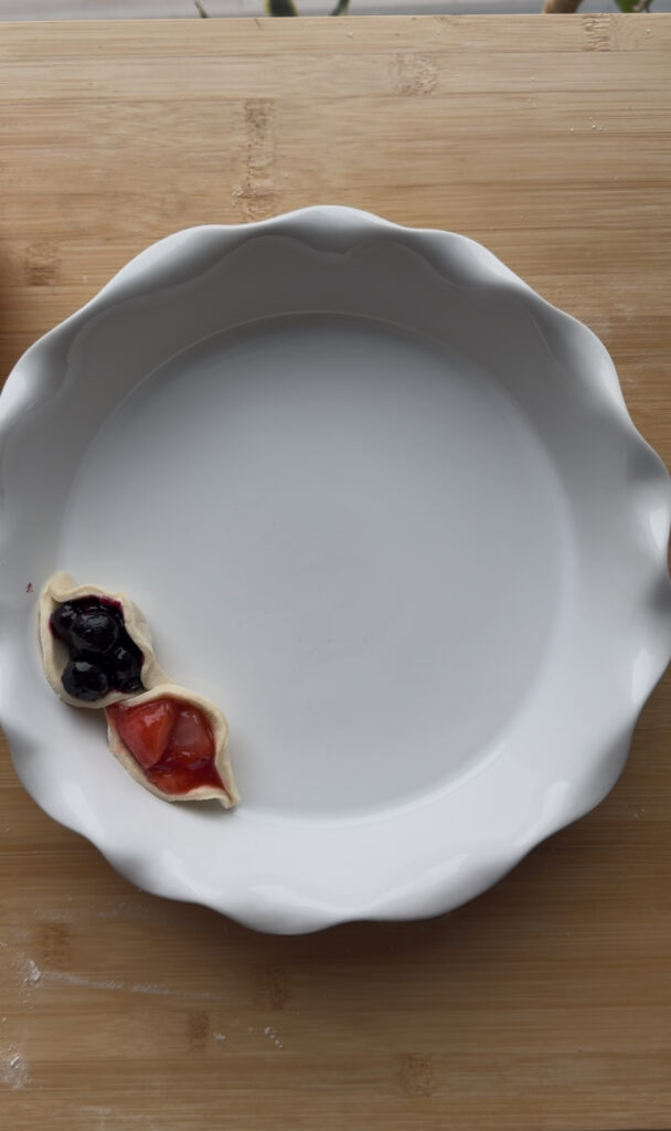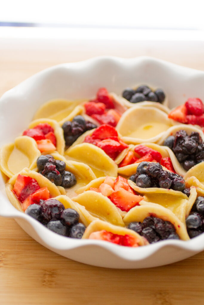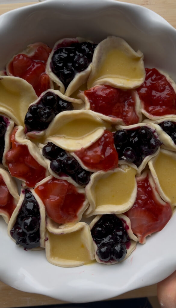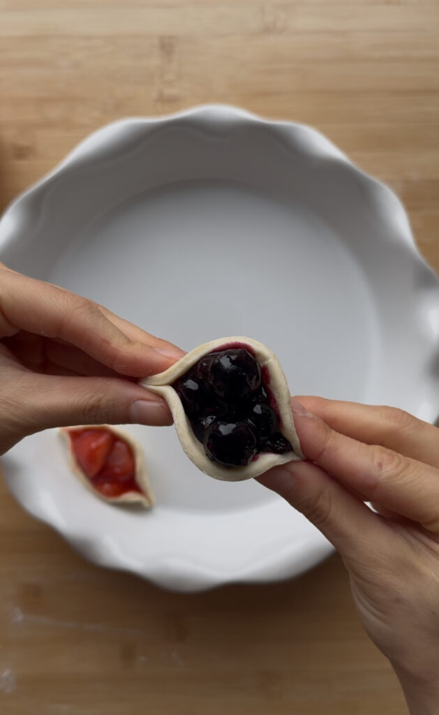 - Set up empty pie rounds for runny fillings: You can use whatever pie fillings you like! I liked this combination of blueberry, strawberry and salty honey filling because the strawberry and blueberry fillings were firm enough to stand on their own. However, I filled in the gaps with empty rounds of pie dough that were pinched shut and added the salty honey filling right before baking because it’s too runny to keep its shape without structure around it.