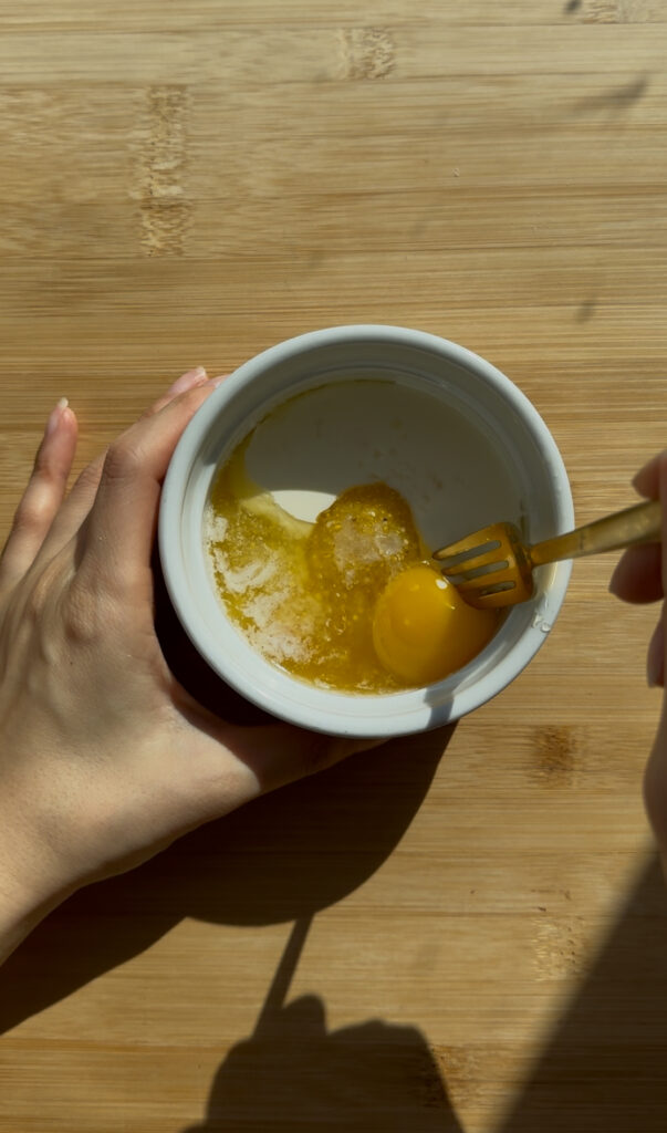 - In a small bowl, combine 1 tbsp unsalted butter, melted, 2 tbsp honey, 1 tbsp melted butter, 1 tbsp heavy cream, 1 tbsp granulated sugar, 1/2 tsp cornmeal, 1/2 tsp apple cider vinegar, 1/4 tsp kosher salt and 1/4 tsp vanilla. Whisk until smooth and set aside.