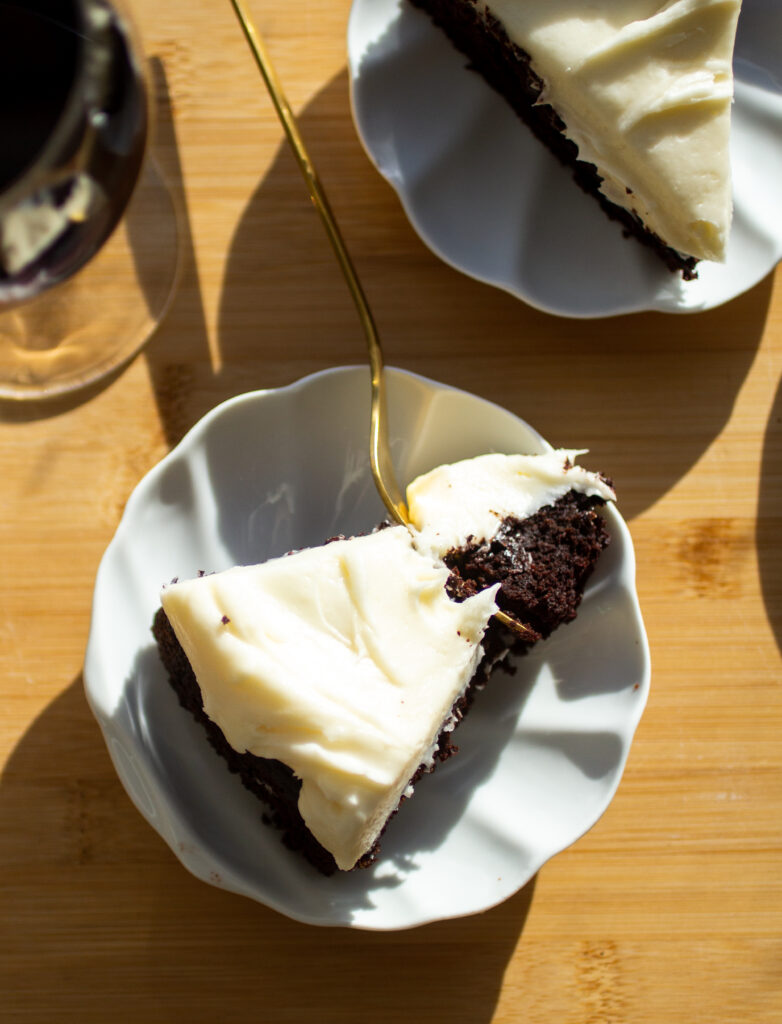 - Added a cream cheese frosting: The red wine kind of reminded me of a red velvet cake and the flavor pairs really well with a fluffy, tangy cream cheese frosting.