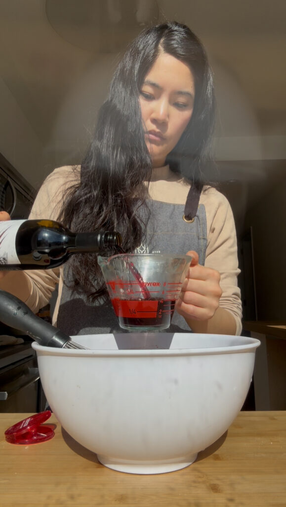 Step 2: Add the wet ingredients (red wine, neutral oil) to the flour mixture and whisk to combine until smooth.