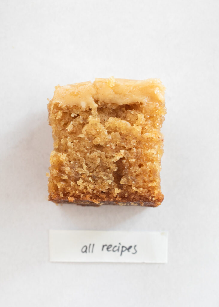 If Molly’s crumb was a bit too thick and spongy for a layer cake, I thought this cake had a lighter, fluffier texture more suited to a layer cake. Though I still wouldn’t describe this cake as “light”–the crumb is relatively tight yet moist and on the thicker side, but just a tad finer-crumbed than Molly’s cake. Unfortunately, baking the entire batch of this batter in a 9×13 proved a bit too much for the pan I used and the bottom was a bit overcooked as you can see in the photo. The overcooked bottom dragged down the overall ratings and a few commenters did note that this cake leaned slightly dry, which it probably wouldn’t be if baked properly. Still, this remained one of my top 3 cakes for texture, though I wanted a stronger peanut butter flavor in the cake itself.
