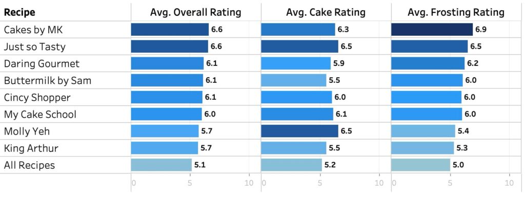 Ultimately, after asking 36 tasters to rank each of the 9 peanut butter cake recipes, Cakes by MK emerged as the overall winner! Just So Tasty was close behind with a slightly higher cake rating. And you can see that Molly Yeh actually tied for the highest cake rating, even though the overall rating landed in 7th place. That, unfortunately, was probably due to topping her cake with the suggested whipped cream instead of finding a different peanut butter frosting for consistency. (More on this cake in the analysis section.)